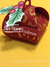 I added the holly - my favourite stamp from the Christmas Gleaming stamp set - which has been coloured using the Cherry Cobbler and Shaded Spruce Stampin' Blends. I also stamped the greeting, fussy cut them both and attached to my little gift box!!